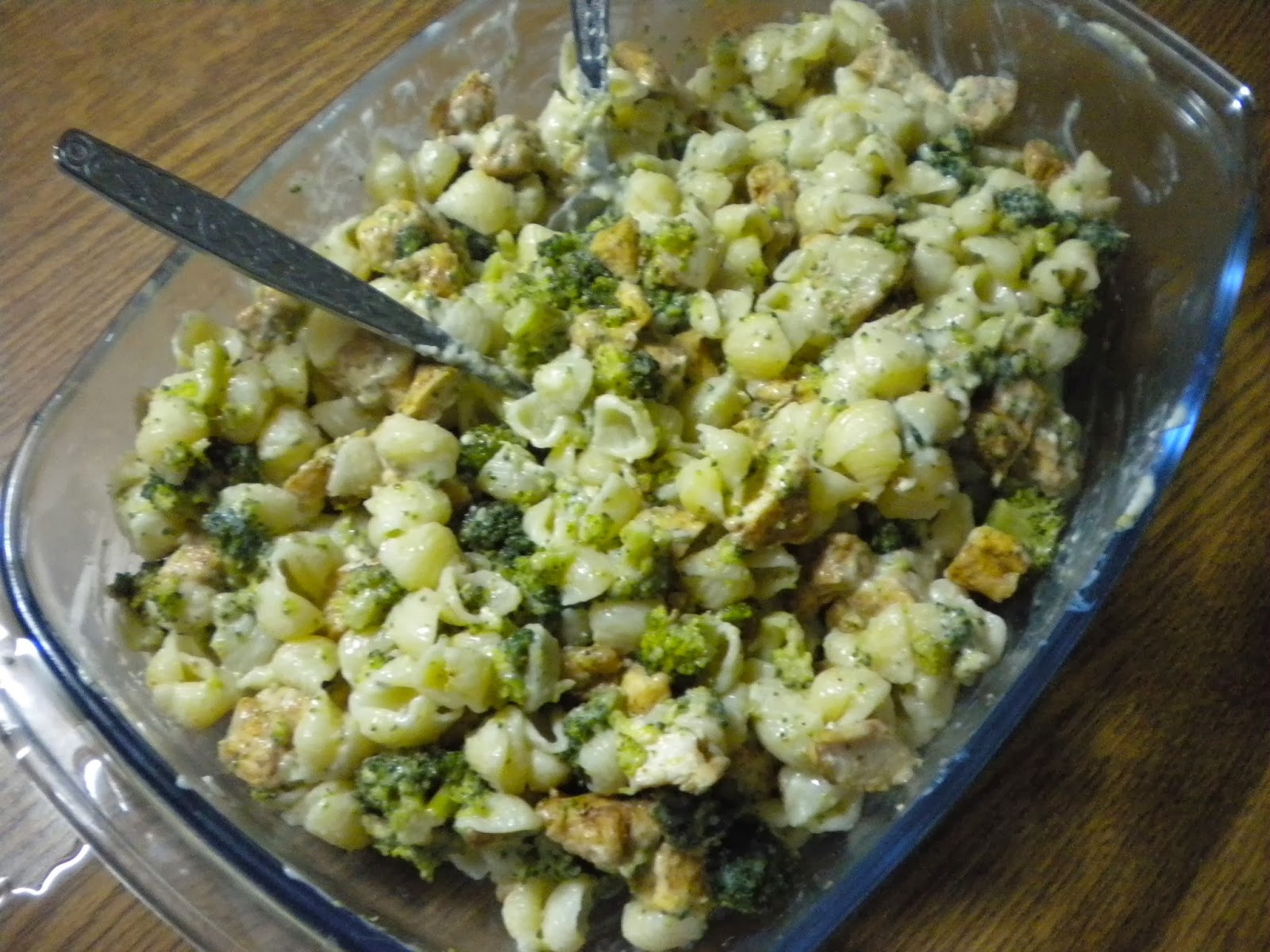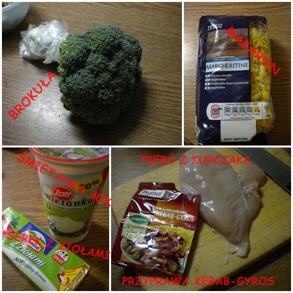 1 dość sporą brokuł, makaron [ muszelki, wstążeczki, ślimaczki itp ], śmietankę 30%, serek topiony "Hohland" z ziołami, 1 dużą pierś z kurczaka, przyprawę kebab-gyros "Prymat".