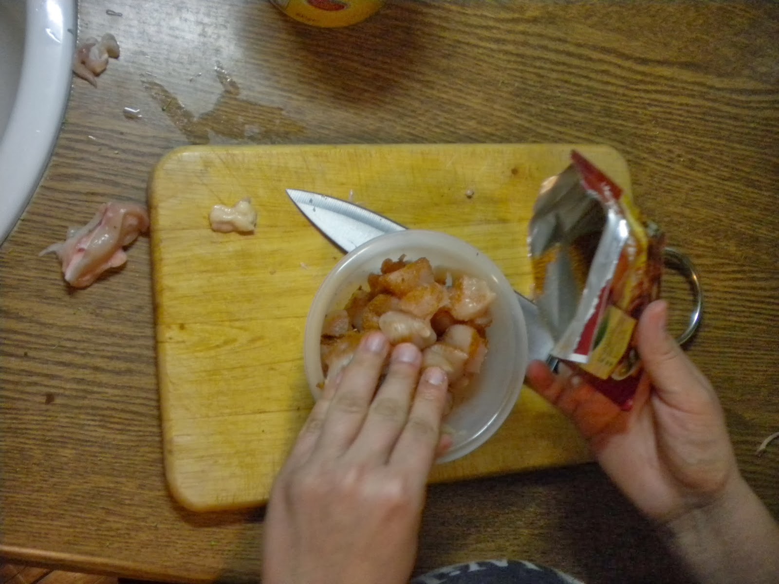 Pokrojoną w kosteczkę pierś z kurczaka doprawiamy przyprawą kebab-gyros "Prymat" , owijamy folią i odstawiamy najlepiej na całą noc do lodówki, bądź przynajmniej na godzinkę aby mięso przeszło przyprawą.