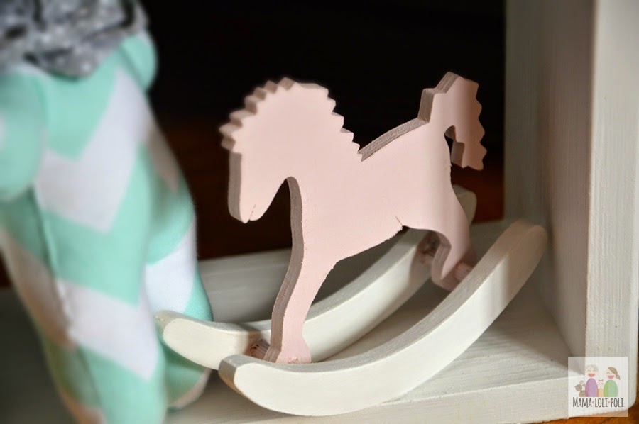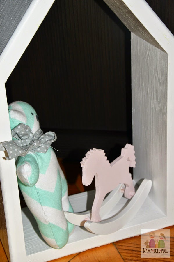 - Biały drewniany domek skandynawski, w którym miejsce znalazł koń na biegunach i malutki kolorowy szmaciany miś. Domek powiesimy na jednej ze ścian pokoju.