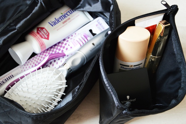 - kosmetyczka (szczoteczka i pasta do zębów, szczotka do włosów, krem do twarzy oraz spakowałam również podkład do twarzy, tusz do rzęs i małe lustereczko :) )