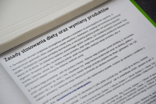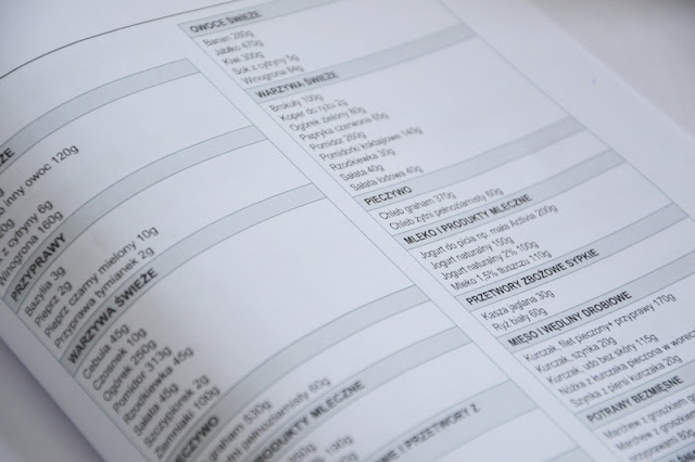 W książce dokładna analiza mojego ciała, wszystkie pomiary oraz przedział w jakim się obecnie znajdowałam ze swoją wagą. Jadłospis mam przygotowany na 2 tygodnie. Każdy dzień opisany z godziną i posiłkiem jaki mam spożyć. Dokładnie wyliczone waga produkty z przełożeniem, np. na plasterki wędliny. Do tego wszystkiego najmniej 1 litr wody w ciągu dnia. Kawę piję maksymalnie 2 razy w ciągu całego tygodnia i zawsze w sobotę mogę zjeść coś słodkiego po 3 posiłku, który zaczynam ok godziny 13. Gdy dostałam swój jadłospis absolutnie nie przerażały mnie posiłku ich przygotowanie, gdyż moim zdaniem nie potrzeba nadzwyczajnych umiejętności, aby przygotować kanapkę z wędliną i warzywami, martwiłam się jedynie, że nie poradzę sobie z jedzeniem tych posiłków w określonych godzinach oraz wydawało mi się, że jest tyle tych produktów do zjedzenia, że pęknę z przejedzenia i nie dam rady zjeść, aż 5 posiłków dziennie. Pierwsze 3 dni były dla mnie na tyle stresujące i tak bardzo się zaangażowałam, że gdy przekroczyłam określoną wagę jakiegoś warzywa, myślałam, że już całą dietę szlak trafił. Dopiero 4, 5 dzień zafundował mi wielką ulgę i o niebo lepsze samopoczucie. Czułam się taka lekka i zadowolona, że nie muszę się katować, nie jeść a co najważniejsze czuje się najedzona i zadowolona, że poradzę sobie z tym lepiej niż myślałam. Gdybym do tego wszystkiego dołożyła jeszcze regularne ćwiczenia, efekt byłby jeszcze większy. Niestety ćwiczenia to coś czego naprawdę nie lubię i robię to zawsze z przymusu. I chociaż mam u siebie w mieście profesjonalną siłownie to niestety ale mi do niej nie po drodze. Głównie skupiam się na mięśniach brzucha i udach, które są moim mega wielkim kompleksem. Wychodzę z założenie, że szybszy marsz, skakanie na skakance już zbliża Nas do osiągnięcia zamierzonego efektu. Całym sercem polecam 10 minutowe treningi z Mel Be. Są genialne! Książka z przepisami ułożona jest na 2 tygodnie, jednak kolejna wizyta jest dopiero po miesiącu od stosowania diety. Swoją książkę przerobiłam już 2 razy i uwierzcie mi, że absolutnie mi się dania nie znudziły. Teraz delikatnie jest modyfikuję, zamieniam produkty bądź wybieram posiłki z innego dnia. Tak naprawdę wybieram to na co mam ochotę danego dnia. Genialnym rozwiązaniem jest zamiana produktów. Jeśli danego dnia mam w posiłku, np. paprykę której niestety zabrakło, odszukuję w książce, która była dołączona do całego zestawu startowego warzywa, które liczy tyle samo bądź nieco mniej czy więcej kalorii i spokojnie zjadam zamiennik. Nie wyrzucam jedzenia, nic się nie marnuje. Dieta jest tak przygotowana, aby produkty rozpisane na kilka dni były w pełni zjedzone, bez marnowania jedzenia i pieniędzy, które wydaje się na produkty.