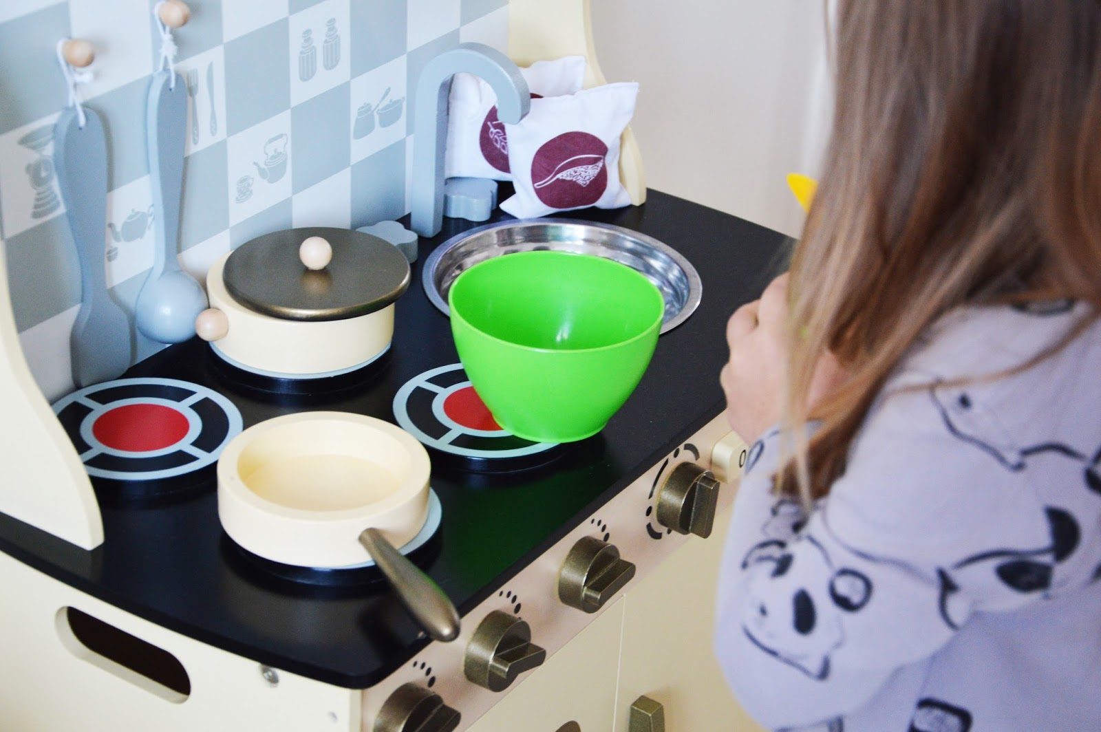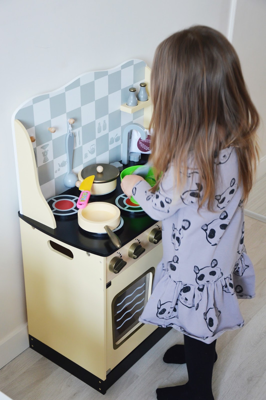 I chociaż w sieci można znaleźć kilka ciekawych pomysłów na stworzenie samodzielnie takiej kuchenki dla dziecka, u Nas absolutnie nie wchodziło to w grę. Brak czasu nas zdecydowanie ogranicza więc odpuściliśmy. Przy małej składce dziadków udało się Nam kupić jak się okazuję wymarzony prezent dla Poli. Od świąt w pokoju stoi duża, solidnie wykona, drewniana kuchenka, którą z dnia na dzień uzupełniamy w potrzebne elementy.