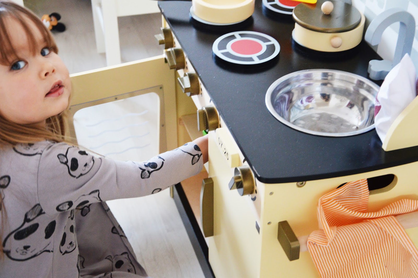 Kuchenka jak i wszystkie elementy zostały zrobione z wysokiej jakości drewna. Kuchenka posiada piekarnik oraz szafkę z zamykanymi drzwiczkami. W blacie kuchni znajduje się metalowy zlew z kranem, płyta grzewcza z 4 palnikami i zegarem. W zestawie dołączony jest garnek, patelnia z pokrywką, 3 akcesoria kuchenne ( widelec, łyżka i łopatka), ściereczka kuchenna, solniczka i pieprzniczka. Kolory kremowy, szary i czarny którymi została pomalowana kuchnia pasują do każdego pomieszczenia. Ma niecałe 80 centymetrów wysokości i 60 centymetrów szerokości. Jest stabilna i perfekcyjnie wykonana. W 100% bezpieczna dla małych rączek, które przygotowują swoje dania :)