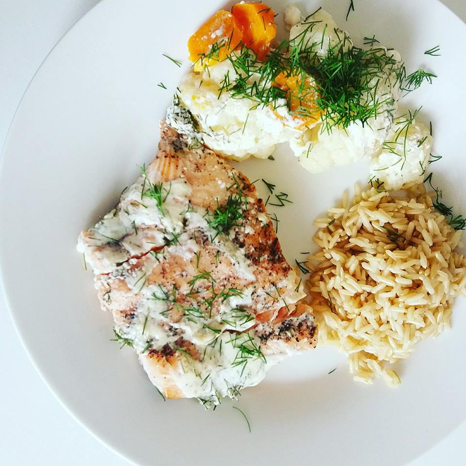 3. Pieczony łosoś z ryżem paraboiled, koprem i kalafiorem