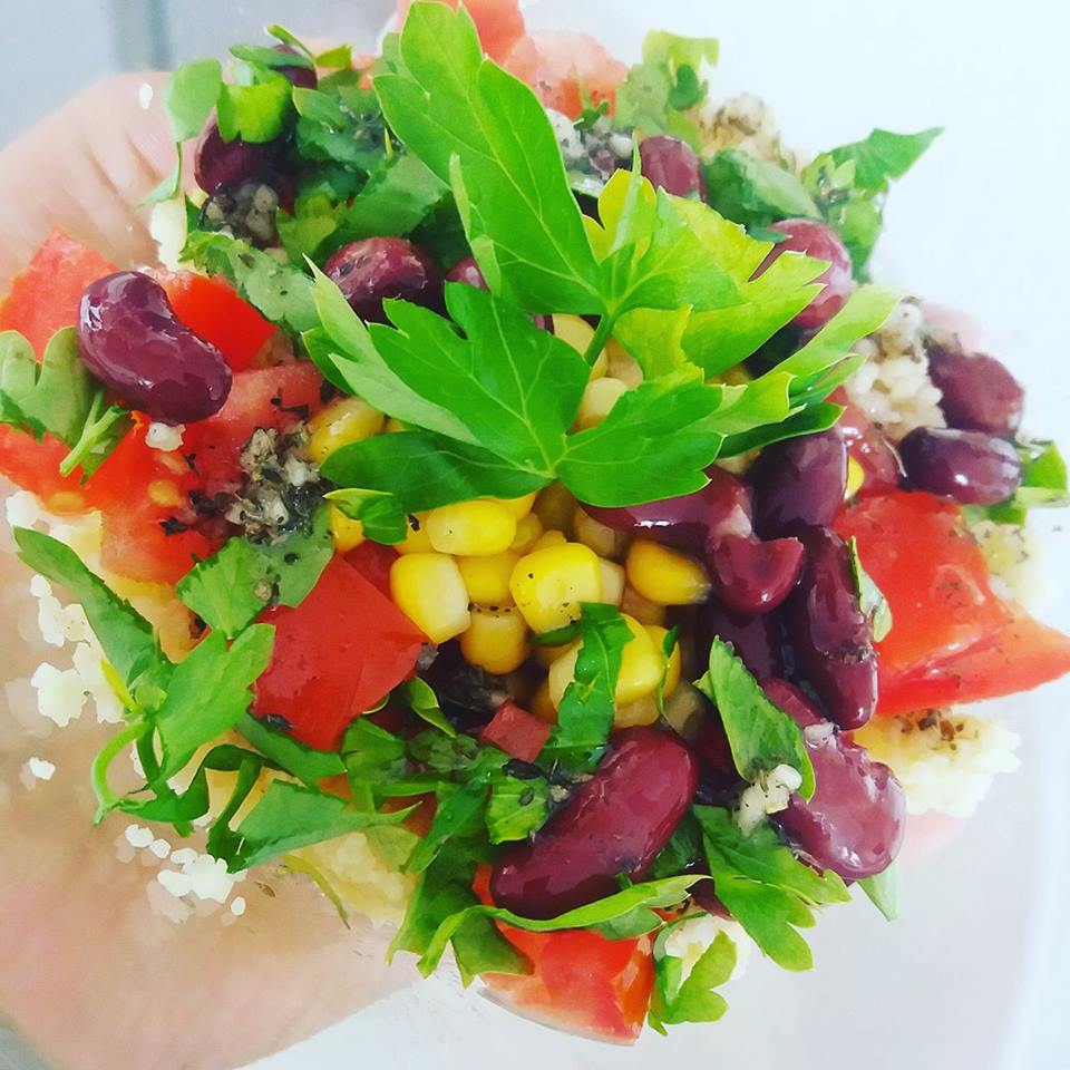 2. Sałatka z kuskusem, czerwoną fasolą, kukurydzą, pomidorem i natką pietruszki