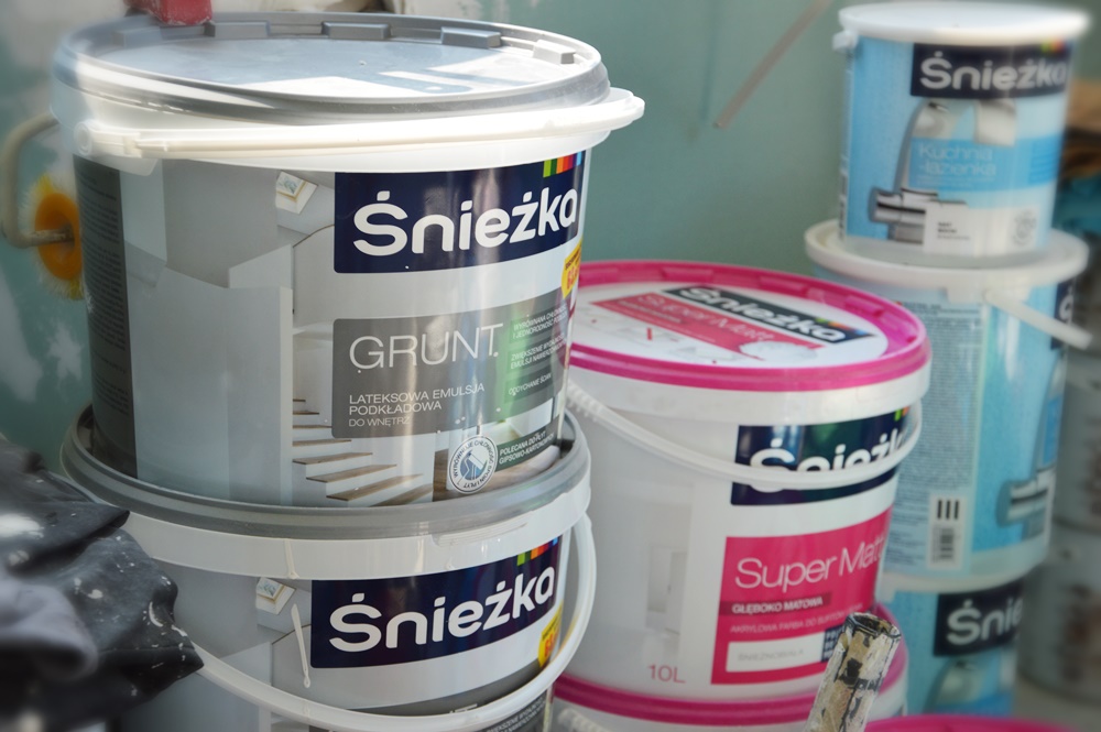 Do malowania ścian i sufitów w całym domu wybraliśmy farby Śnieżka. Ściany pomalujemy na bardzo jasny, śmietankowy odcień Śnieżka Satynowa. Zarówno farba, jak i kolor, który wybraliśmy jest nam dobrze znany, gdyż obecnie nasze całe mieszkanie jest pomalowane właśnie w tym kolorze. Przed gruntownym malowaniem, nałożony został Grunt- specjalna emulsja, która przygotowuję ściany do koloru. Sufity zostały wykończone matową, białą farbą Śnieżka Super Mat.