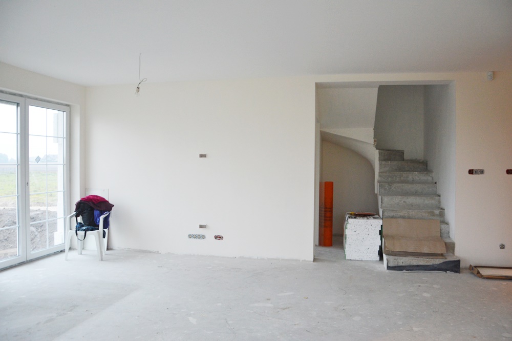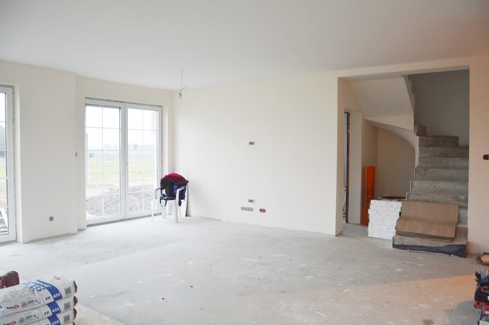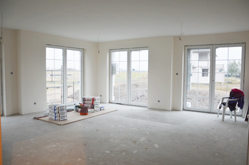 Już od samego początku, gdy zdecydowaliśmy się na kupno domu założyliśmy, że salon koniecznie musi być duży z otwartą przestrzenią na jadalnię. Chcieliśmy również, aby w salonie było dużo okien, które nie tylko wizualnie powiększają całą przestrzeń, a przede wszystkim nadają elegancji i dużo światła. Już w pierwszym domu, który oglądaliśmy salon, był tak zaprojektowany, że na całych dwóch ścianach zostały umieszczone duże, piękne okna z przejściem na taras. Niestety dom kosztował majątek, którego my nie posiadaliśmy :) Szybko jednak udało nam się znaleźć dom, w którym salon jest równie piękny z dużymi oknami, które naszym zdaniem idealnie pasują do całego założenia i stylu, w jakim chcemy wykończyć nasz dom.