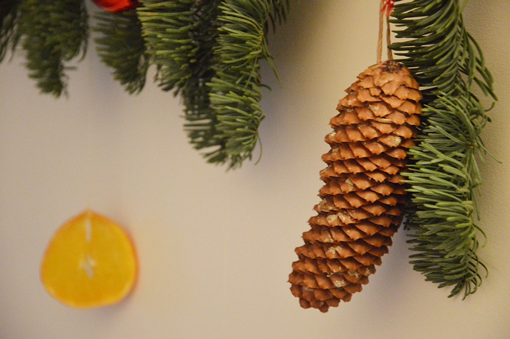 Wchodzę do domu z mroźnego spaceru z dziećmi, od progu czuję zapach pomarańczy i zapach lasu, zapach szyszek, które uzbierałam do wiklinianego koszyka w lesie. Ususzone pomarańcze cudownie komponują się w świerku, który powiesiłam w samym korytarzu na jutowym sznurze. Od samego progu czuć las i zapach pomarańczy. Jest przytulnie, domowo. Na podłogę spadają igły świerku, które kują w dłonie. W tej zieleni jest ukryty zapach Świąt. Magicznych Świąt.